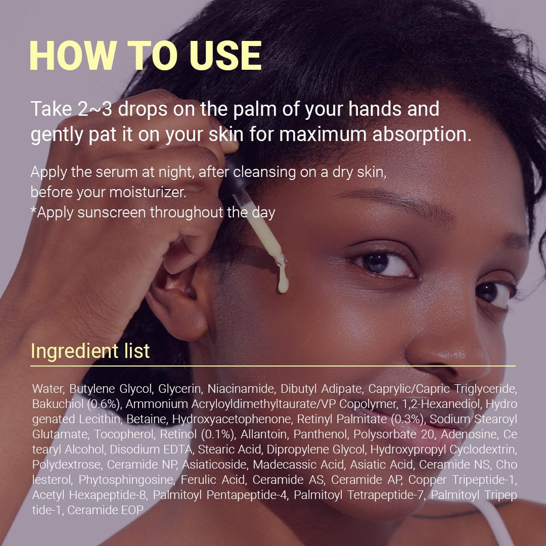 Water, Butylene Glycol, Glycerin, Niacinamide, Dibutyl Adipate, Caprylic/Capric Triglyceride, Bakuchiol(0.6%), Ammonium Acryloyldimethyltaurate/VP Copolymer, 1,2-Hexanediol, Hydrogenated Lecithin, Betaine, Hydroxyacetophenone, Retinyl Palmitate(0.3%), Sodium Stearoyl Glutamate, Tocopherol, Retinol(0.1%), Allantoin, Panthenol, Polysorbate 20, Adenosine, Cetearyl Alcohol, Disodium EDTA, Stearic Acid, Dipropylene Glycol, Hydroxypropyl Cyclodextrin, Polydextrose, Ceramide NP, Asiaticoside, Madecassic Acid, Asiatic Acid, Ceramide NS, Cholesterol, Phytosphingosine, Ferulic Acid, Ceramide AS, Ceramide AP, Copper Tripeptide-1, Acetyl Hexapeptide-8, Palmitoyl Pentapeptide-4, Palmitoyl Tetrapeptide-7, Palmitoyl Tripeptide-1, Ceramide EOP
